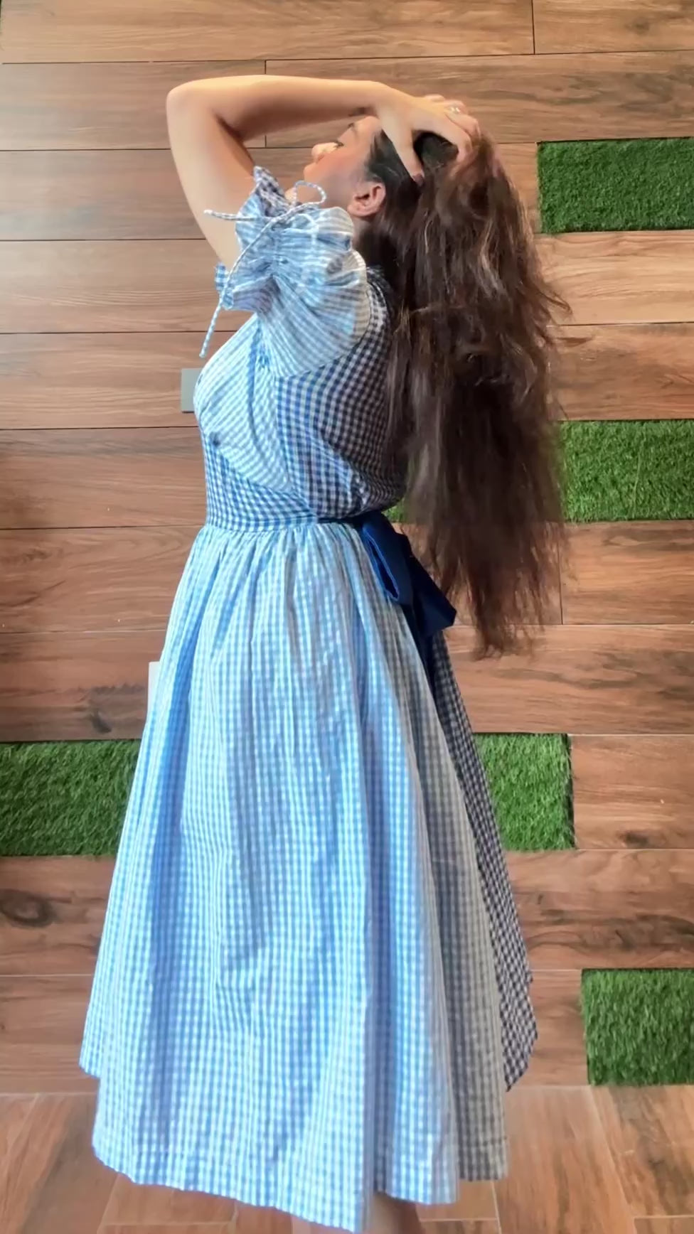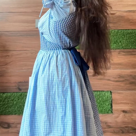 DETAIL : Fit & flare silhouette | V-neckline | Mixed gingham panels | Puff sleeves with tie detail