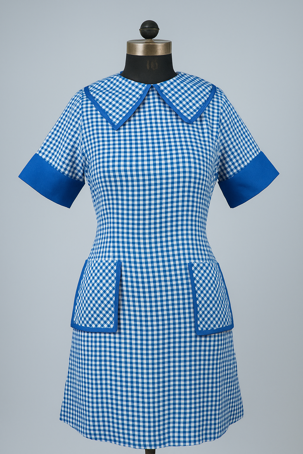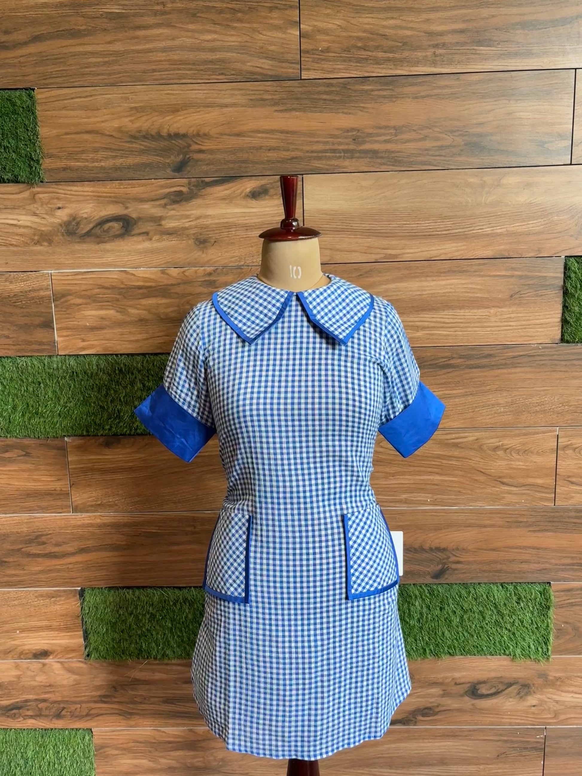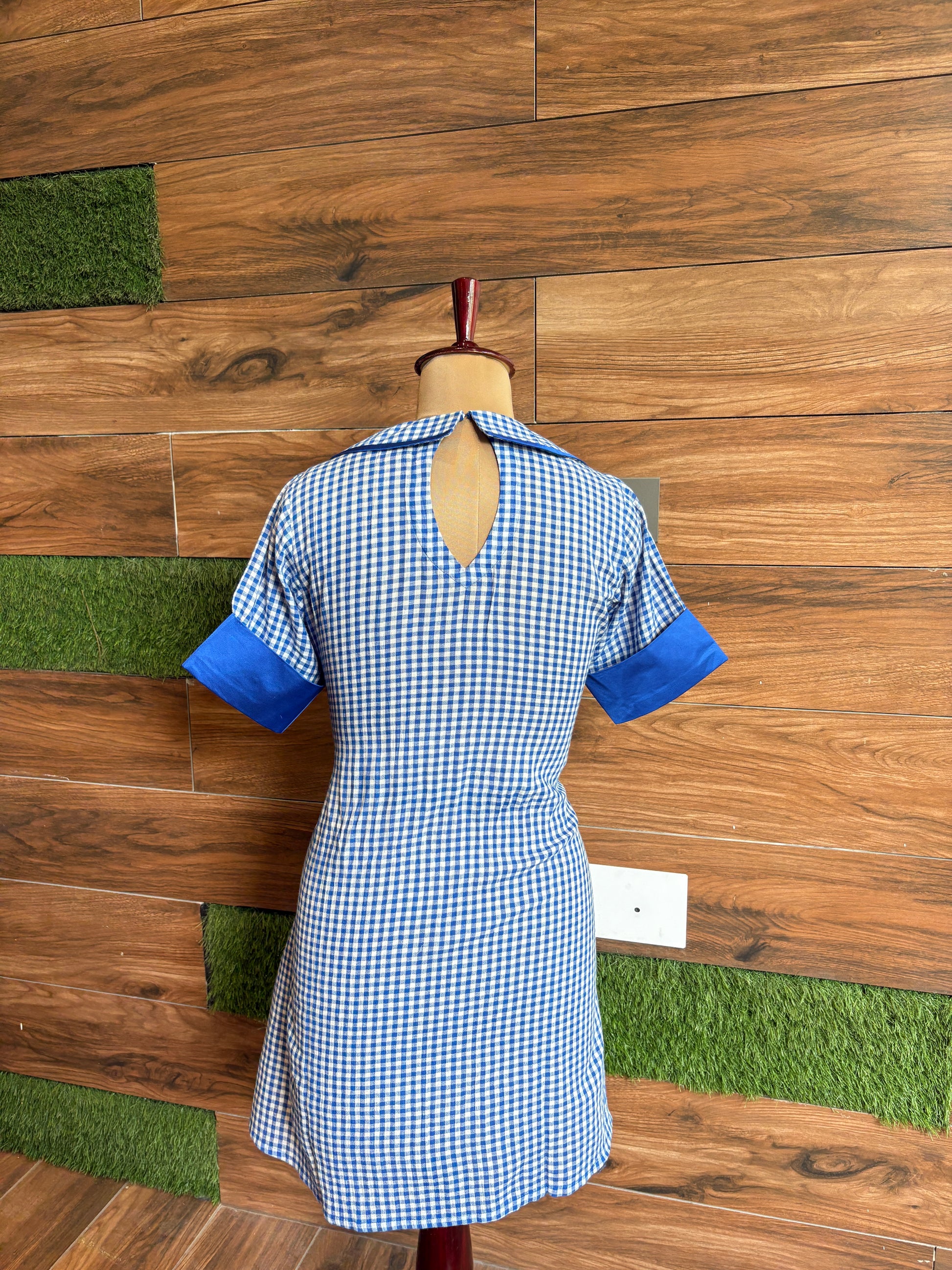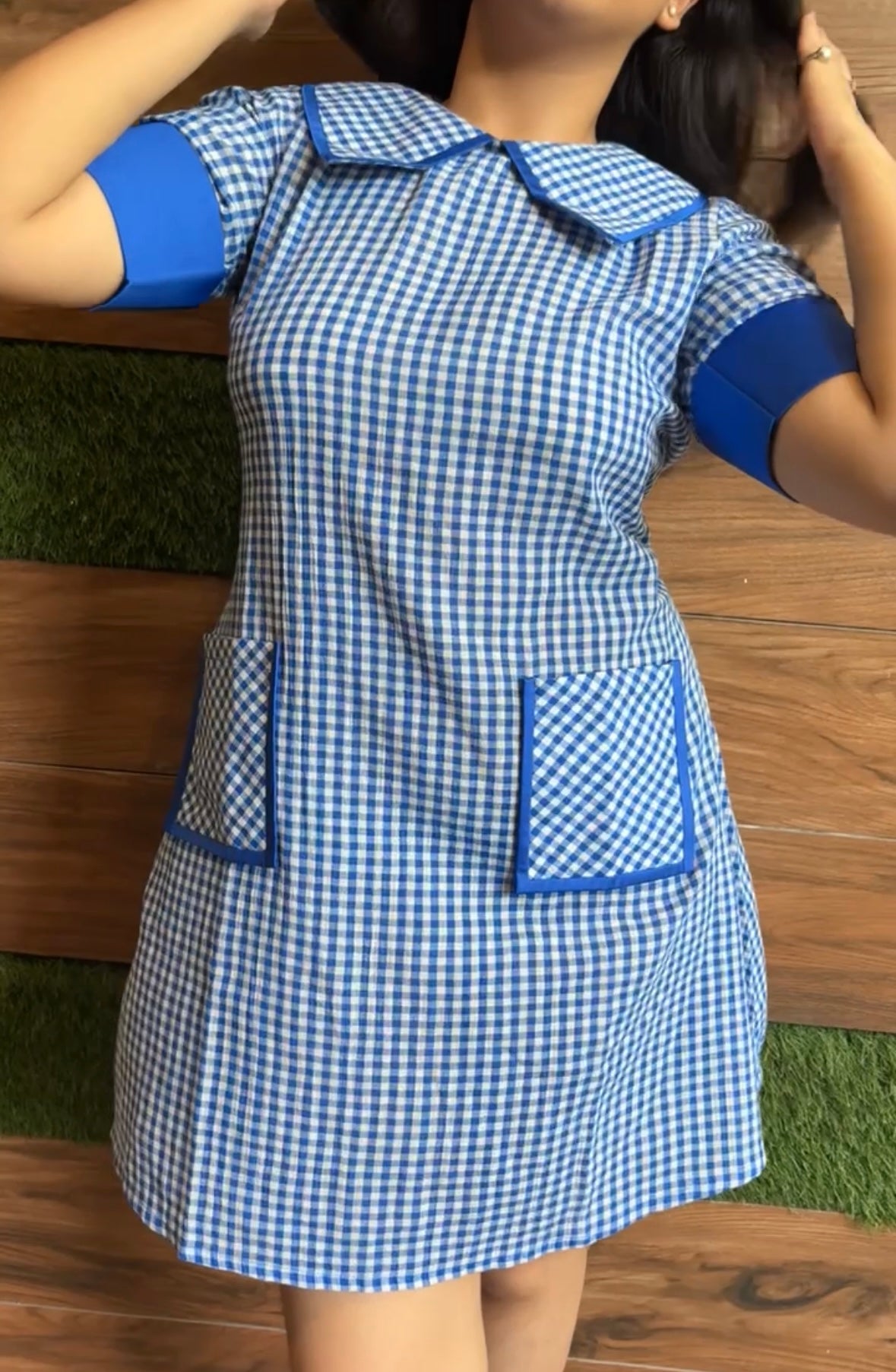 DETAIL : Fit & flare silhouette | V-neckline | Mixed gingham panels | Puff sleeves with tie detail