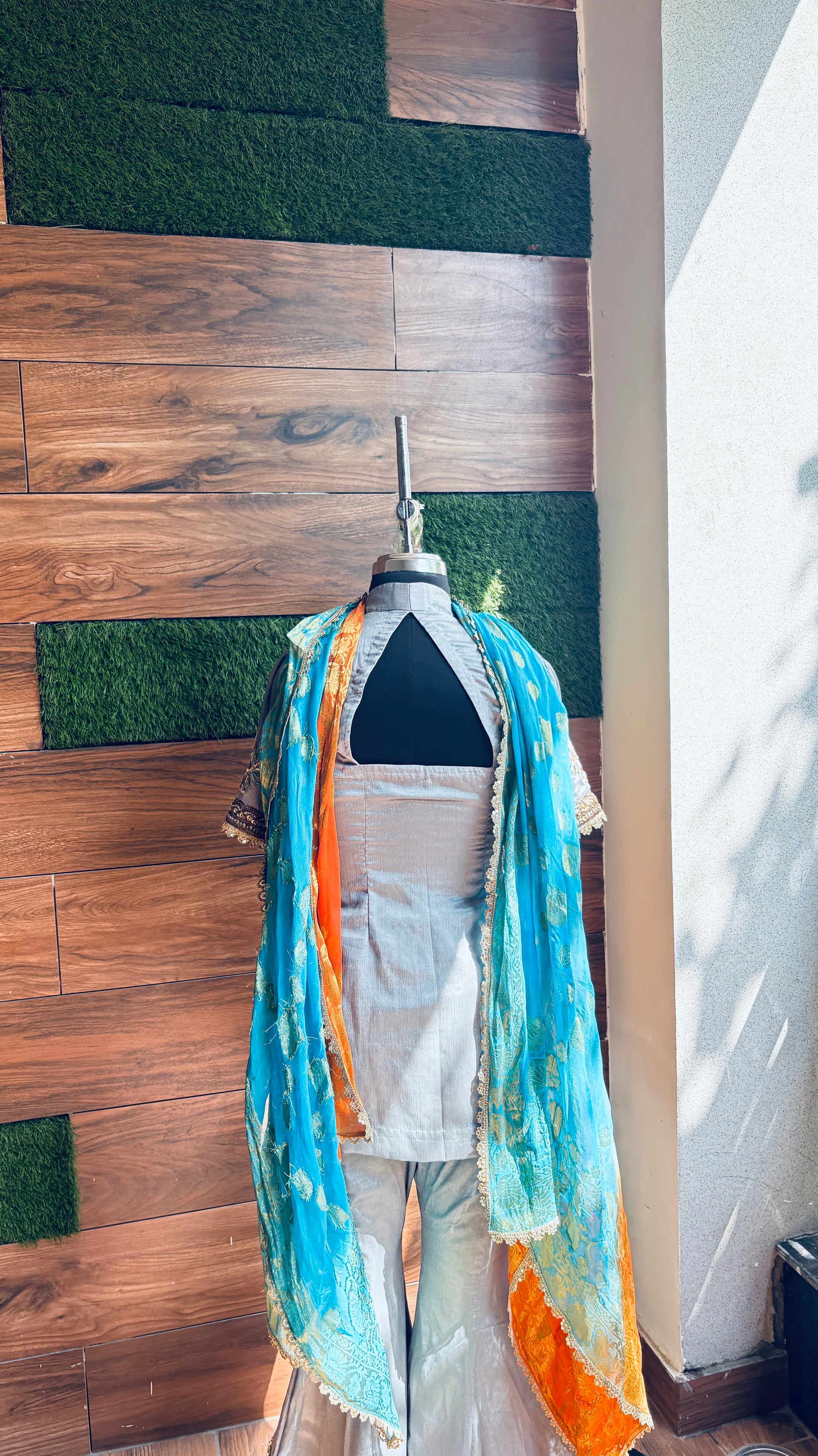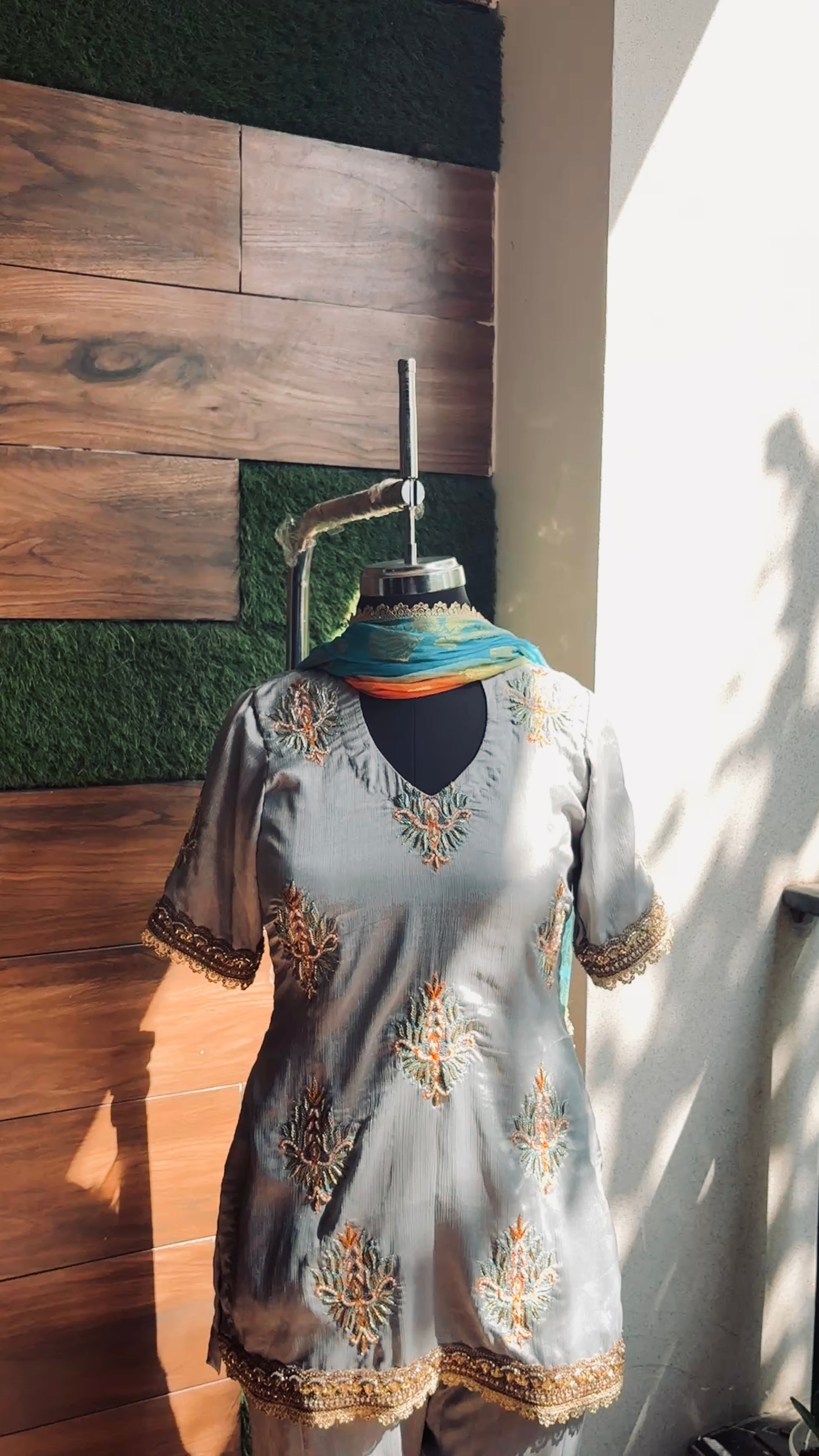 - Comes as a three-piece set with kurta, bottoms, and dupatta.