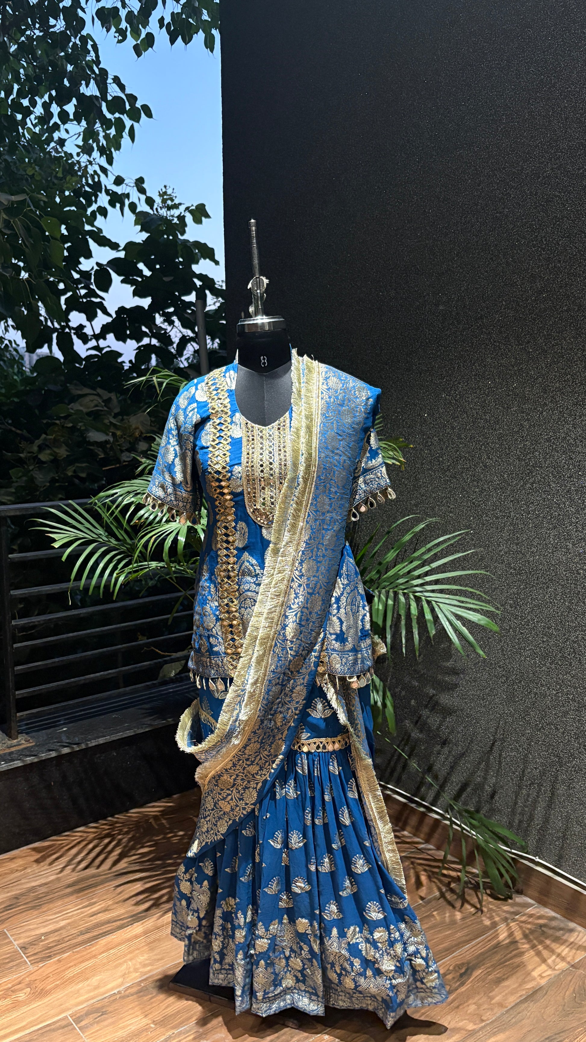Work: Intricate gold zari brocade with handcrafted mirror lace detailing.